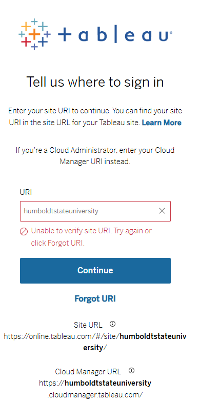 Our Tableau Cloud site is currently experiencing a service interruption and is unavailable. Users may receive an error message saying that ther site URI is unable to be verified.